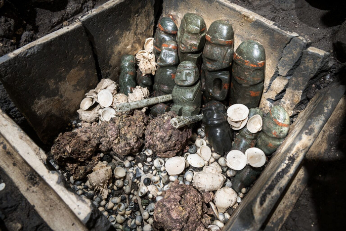 Вновь обнаруженные подношения, получившие идентификационные номера 186, 187 и 189, покоились в особых каменных сундуках, называемых тепетлакалли. Причём сундук под номером 186 был найден ещё в 2023 году, а остальные два лишь в ходе последнего полевого сезона. Но что самое интересное, сундуки вместе со своим содержимым совпадают по времени захоронения с тремя другими подношениями, найденными в прошлые десятилетия. Например, подношения №18 и №19, были обнаружены ещё в конце 1970-х годов на западной стороне большой храмовой пирамиды, а №97 — на северной стороне в 1991 году. Все они также содержали нефритовые статуэтки в количестве около 40 штук. Считая с новыми находками, число фигурок доходит до 83 экземпляров.