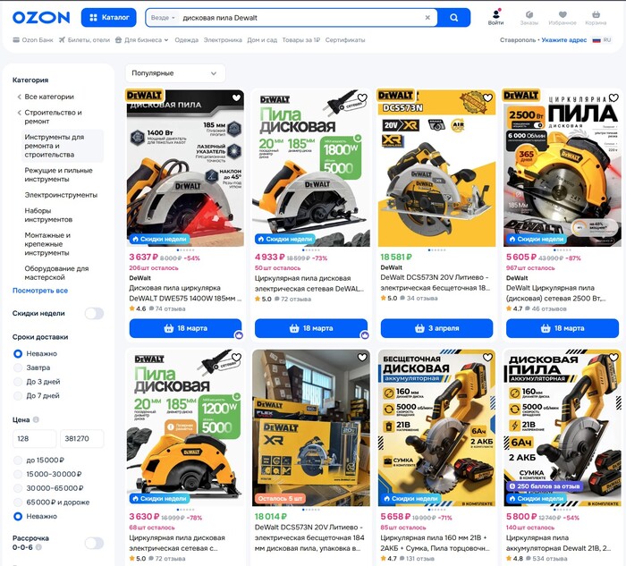 Итак, ты заходишь на озон, чтобы купить себе новенькую дисковую пилу по привлекательной цене, вбиваешь "дисковая пила DeWALT" в поиск и видишь это: