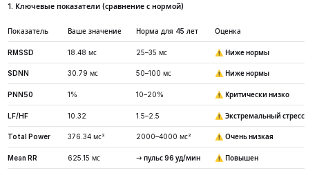 Норма в таблицах ниже - спокойное состояние отдохнувшего человека 45 лет, замер утром как проснулся. Тоесть не норма при аналогичных нагрузках. Отклонения от нее показателей в таблицах ниже - показывают насколько я ушатан после трени.