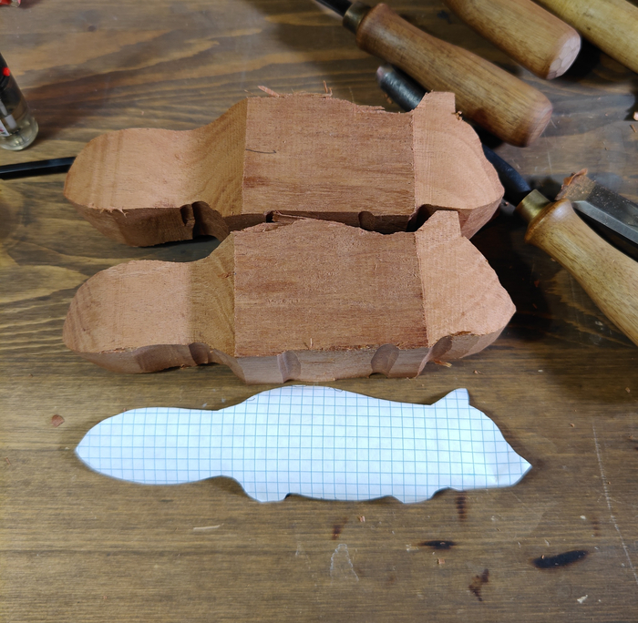 1. Перевожу на брусок фигуру и грубо отпиливаю. Если древесина липа или ольха, то можно срезать лишнее, так будет даже быстрее, чем грубое спиливание