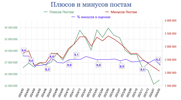 А отмена автобана по рейтингу и отображения минусов уронили количество плюсов постам до уровней 2017 года и пока тенденция их роста не просматривается.