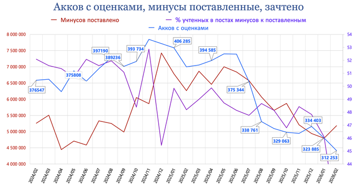 А вот как обстоят дела с минусами: у постов в среднем в месяц за последние полгода мы видим 2 945 626 поставленных минусов в месяц. А пользователи, судя по информации из их профилей, ставят по 5 263 001 минусов (на 79% больше). И вы не поверите, но здесь нет никакой конспирологии.