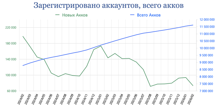 В феврале на Ресурсе зарегистрировалось 74 044 Пользователей (на 20 584 меньше к предыдущему месяцу) и всего их стало 11 617 669.