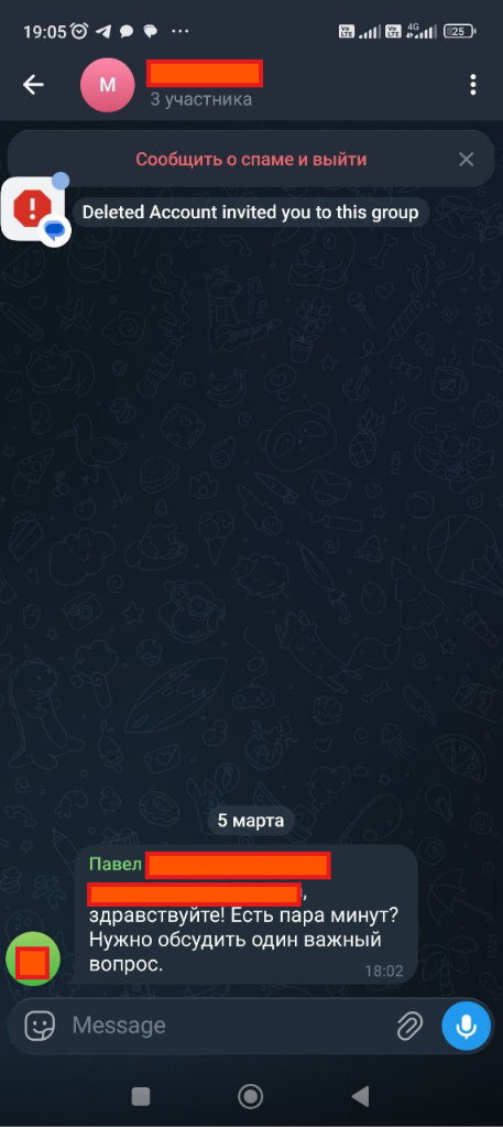 За последние несколько суток некоторые коллеги получили вот такие сообщения в Телеграмме. Т.к. в компании проводится обучения по действиям с мошенниками, то ни каких последствий таки сообщения не приводят. Следует отметить что мошенники обходят установленный запрет на сообщения не из контакт-листа и пользуются другой "дырой" - оставленной возможностью добавления в группы (для более оперативного создания рабочих групп).