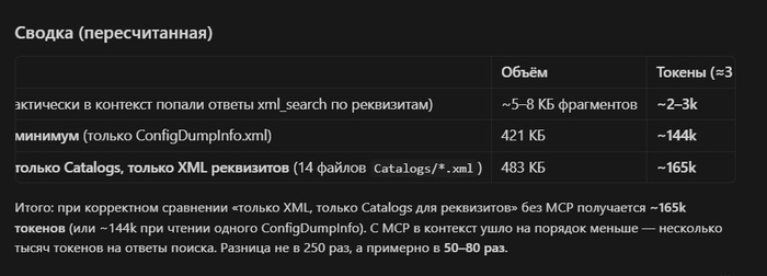 Умеет искать функции/процедуры/модули, реквизиты, объекты и т.д. в выгрузке конфигурации скриптом (а не за счет токенов вашего ИИ-агента). Токенов на поиск с MCP улетает в 50 раз меньше, если верить расчету LLM )
