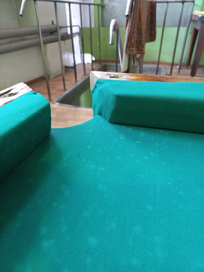 Резина была в более-менее нормальном состоянии. Сетки на выброс. Листы ДСП были кривые от воздействия влаги. Новые листы нам дали в деревообрабатывающем цеху. Опор не было куда то потерялись. Сделали новые, покрыли Хим. Окс. прм. Сетки заказали на Озоне. Самое сложное было найти сукно. Новое стоит дорого. Нашли бу за хорошие деньги с другого города. У нас стол 10 футов, а сукно с 12 футового, то есть нам еще и на борта должно хватить. Лузы отполировали превели в порядок. Долго выставляли листы ДСП и стыковали между собой.