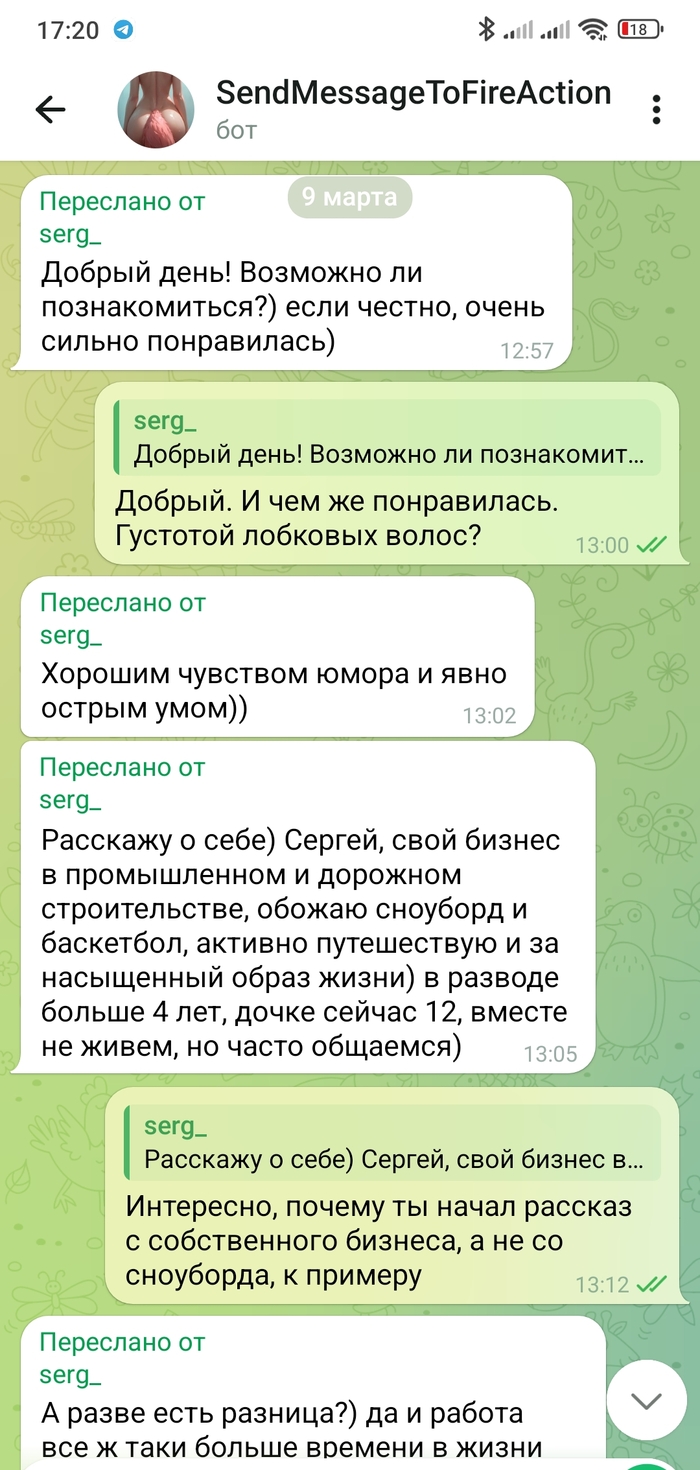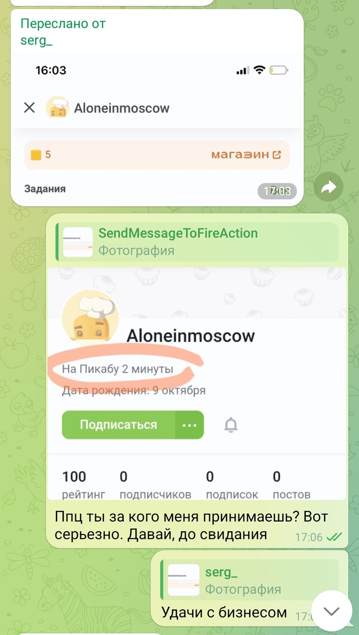 Он реально думал, что я не пойду и не проверю?🤣🤣🤣 Тут дятел окончательно отлетел. Я уж опущу момент, что мой пост, который его зацепил, вышел в 12:48, а к 13:02 Серёжа уже прочитал все мои 300+ высеров постов и очень заинтересовался моей личностью. Но в целом - бездарно, Серёжа, поработай над логикой!
