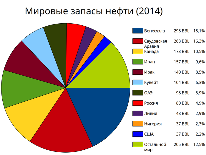 Мировые запасы нефти по странам. Венесуэла — крупнейший держатель: 298 млрд баррелей, 18% мировых запасов. Источник: Wikimedia Commons, CC0