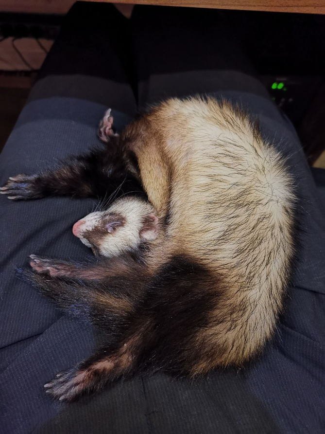 Он прожил длинную жизнь для хорька, почти 9,5 лет. Вредный пакость, любитель массандровских красных полусладких и десертных вин, и медового бурбона от Jim Beam (не знаю почему именно именно они, но остальные он даже нюхать отказывался😁), и красивых девушек, бесстрашный одноглазый (была врождённая глаукома) Капитан Рикки Хорь.