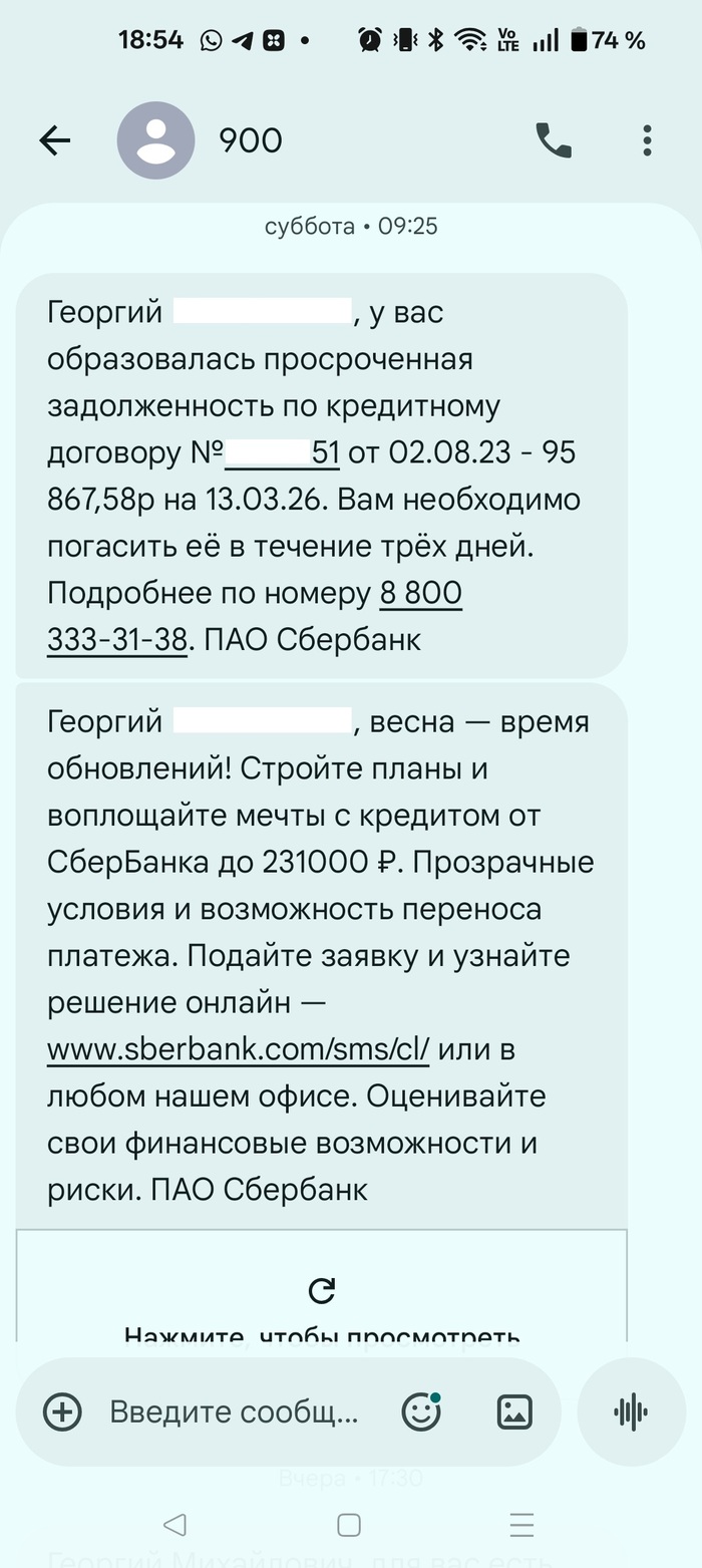 14.03.2026 в 09:25 я получил с номера 900 SMS-сообщение следующего содержания: