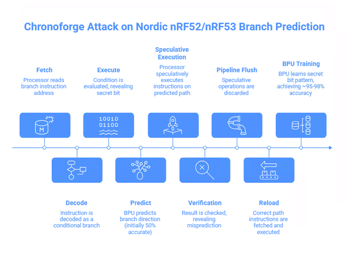 Chronoforge CPA атака демонстрирует, что информация о времени выполнения криптографических операций может полностью скомпрометировать приватный ключ ECDSA. Средняя точность восстановления 94.5% на реальном оборудовании (nRF5340) показывает, что эта не теоретическая угроза, а практический способ компрометации кошельков.