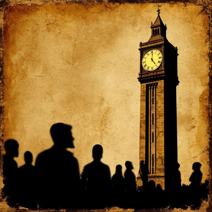 Обложку для альбома я попробовал сделать с нимимумом нейросетей, сделав какую-тотзаглушку, заменив циферблат на читаемый, искривив людей под образы и оставив место под название альбома: