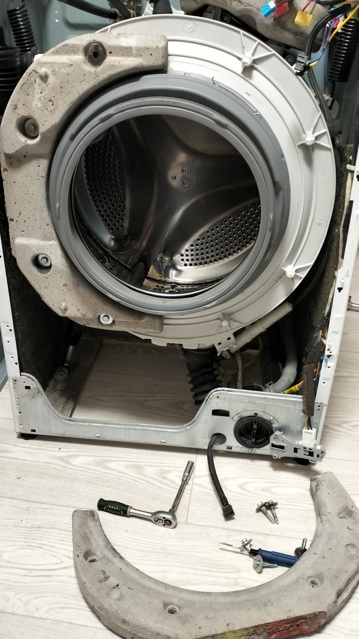 Здезь на фото патрубок через который заливается в барабан порошок и кондиционер. Он резиновый, от вибрации протерся об камни противовеса и машинка начала течь сразу после запуска стирки. Нашёл не сразу, но по факту быстро "лечится". Там только снять верхнюю крышку, отсоединить трубки, лоток, вынуть патрубок, просушить, проклеить и поставить обратно. Это случилось где то месяца за два перед заменой подшипников