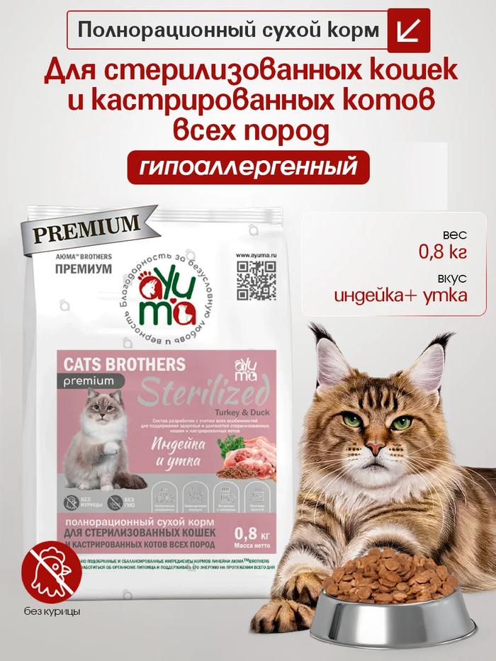 Для стерилизованных кошек с аллергией: Обратите внимание на специализированные корма, такие как AYUMA для стерилизованных, которые контролируют вес и при этом гипоаллергенны.