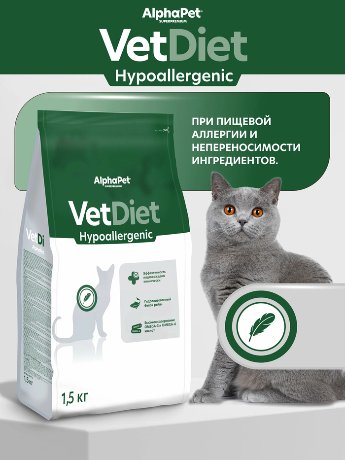 «Ветеринар прописал AlphaPet Vet Diet для кошки с атопическим дерматитом. Состояние улучшилось, зуд прошёл. Используем как исключающую диету. Дорого, но работает.»