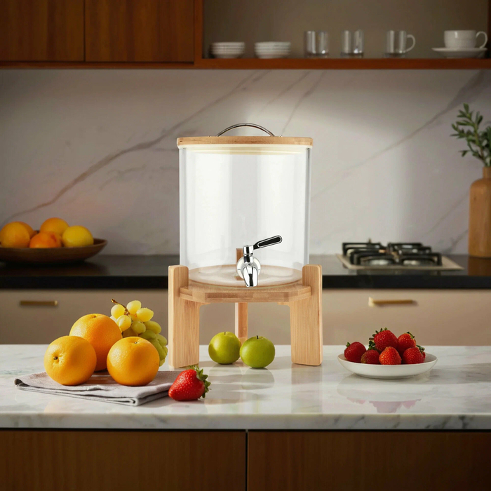 Это ваш роскошный и функциональный лимонадник гигантского объёма, созданный для масштабных праздников и больших компаний. Восемь литров вместимости позволяют забыть о постоянном доливе напитков. Стильная бамбуковая крышка с силиконовым уплотнителем обеспечивает герметичность и сохраняет свежесть.