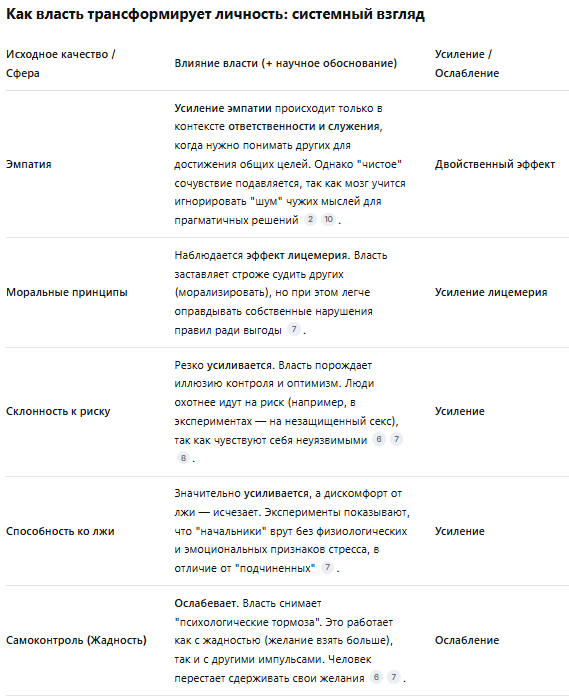 Привет. Можешь собрать в единую систему выводы из исследований влияния власти на человека? Усиление/ослабление позитивных и негативных качеств интересует. Например: Жадность+власть= усиление жадности Или Эмпатия+власть= усиление эмпатии