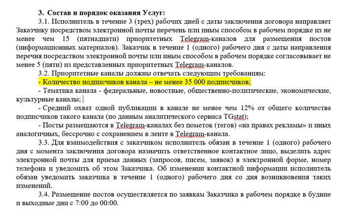 Суть контракта - Победителю необходимо будет опубликовать в течение года не менее 1015 постов в ТГ-каналах численностью от 35 000 подписчиков.