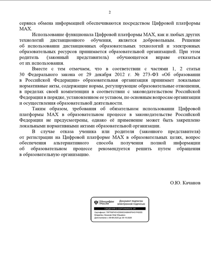 Теперь у нас есть официальный документ, подтверждающий именно то, о чем мы говорили с самого начала: установка MAX добровольна, принуждение к установке незаконна, отказ от приложения возможен в любой момент, а учебную информацию учащиеся могут получать и альтернативным способом.