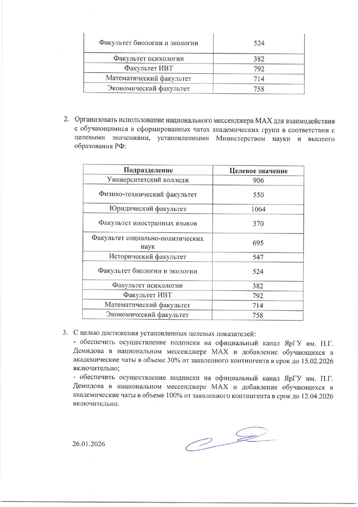 В конце января 2026 года старостам на почту приходят сообщения о том, что необходимо выполнять "Распоряжение", т.е. регистрироваться в Максе и подписываться на официальные странички ЯрГУ. Для чего - для выполнения указа и поддержки имиджа университета. (Забавное замечание: численности факультетов указаны на 1 октября 2025, а отчисления у нас происходят ближе к концу октября-началу ноября + у нас на матфаке есть программа специалитета, которые учатся всего лишь 5,5 лет, так что как минимум нашему математическому факультету набрать заявленное количество человек примерно невозможно.)