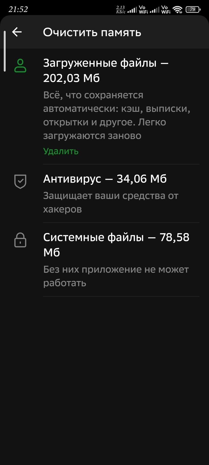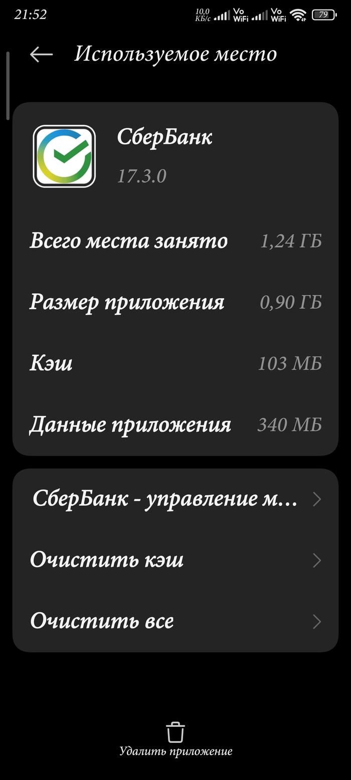Сегодня утром телефон стал жаловаться, что у него заканчивается память. Ну ок, полезла в список приложений. И оху... изрядно удивилась. Потому, что во главе списка гордо красуется Сбер, занимая аж 1,5 гигабайта.