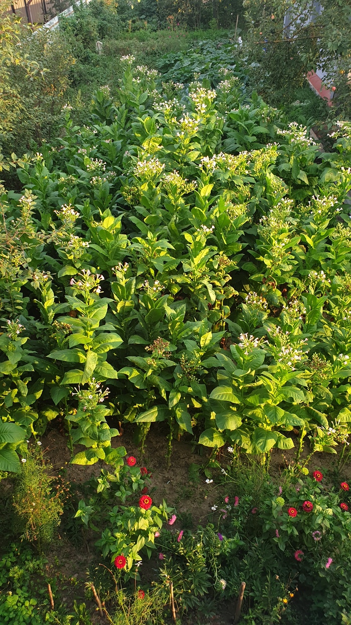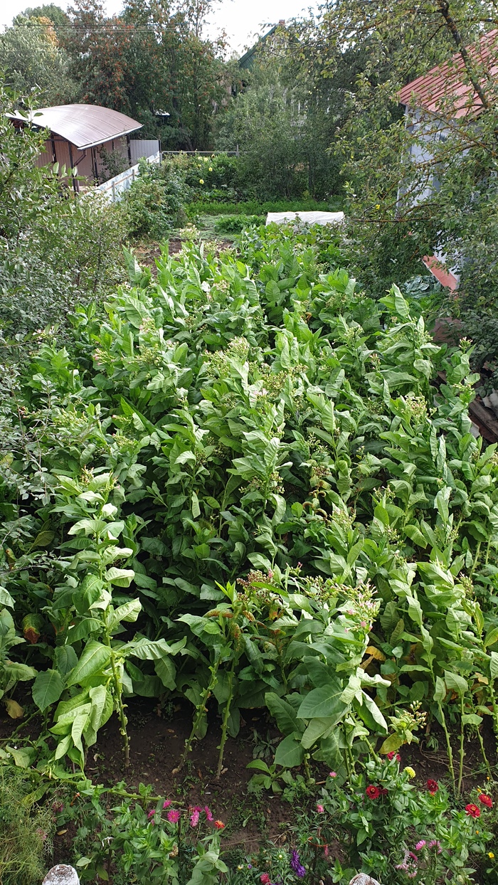 Цветёт и пахнет моя плантация. Смотрите сколько цветуёчков :) Опытные табаководы советуют срезать макушки, чтобы повысить урожайность. С урожайностью у меня и так всё хорошо, поэтому решил не делать ничего. Пущай растёт как природой ей положено.