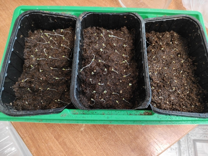 Так выглядит вся плантация) Думаю как только первые один-два листа сформируются буду пробовать рассаживать ростки по отдельным горшкам.