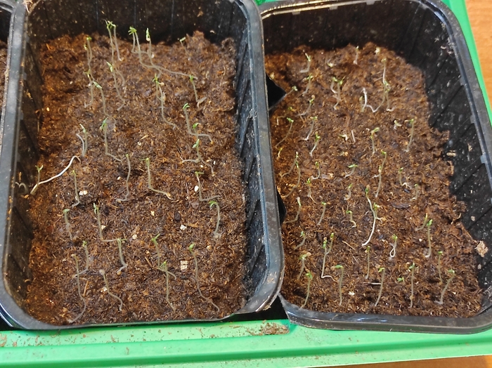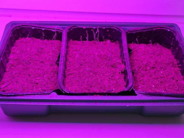 Некоторые семена хорошо проросли ещё в блюдце. Здесь заодно проверю будут ли растения вытягиваться под лампой по сравнению с первыми посадками, которые я сначала держал в тёмном месте.