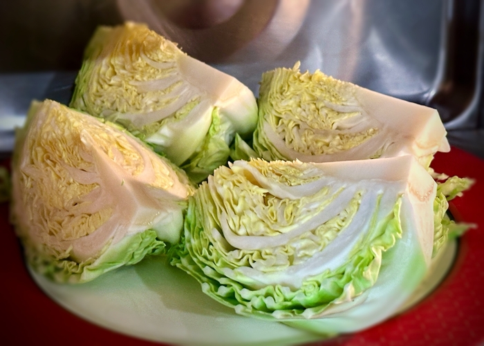 Разрезала кочан на четыре доли (или «части» - правильно?). Буквально на пять минут поставила капусту в микроволновку. Чтобы, значит, смягчить и … типа подвялить.
