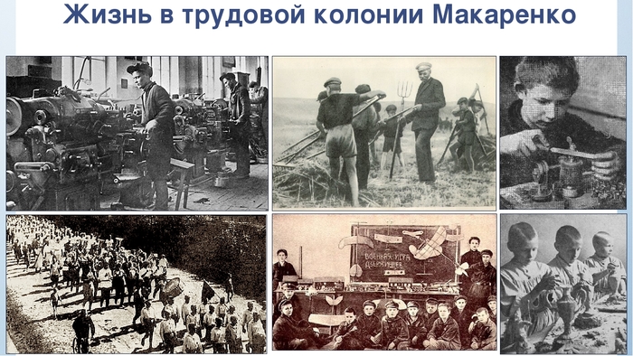 Первое: труд как основа жизни, но не самоцель. В колонии все работали. Сначала — чтобы прокормиться: пахали, сеяли, ухаживали за скотом. Потом — чтобы жить достойно: открыли столярные и слесарные мастерские. Но Макаренко подчёркивал: труд без образования, без нравственного развития превращается в простую мускульную работу. Только соединение труда с высокой технической культурой и пониманием общественной пользы воспитывает личность .