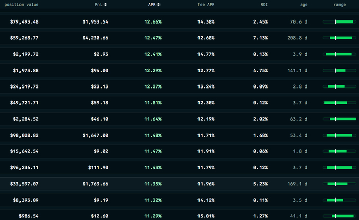На скрине доходность различных позиций в пуле: у кого сумма большая и готов следить за позицией, выставляет узкий диапазон и получает 30-60% годовых. Диапазон узкий, поэтому переставлять позицию приходится довольно часто (возраст большинства позиций в узком диапазоне 2-4 дня).
