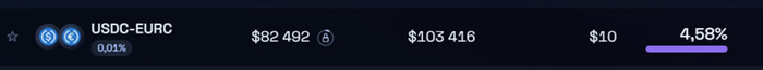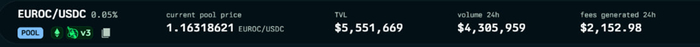 Пул EURC-USDC 20%. EURC выпускается Circle, как и USDC, сейчас капитализация почти полмиллиарда, и довольно хорошие объемы торгов, что дает неплохие комиссии. Основной минус – ликвидность сосредоточена в сети Эфира, именно в основной сети, а не на более дешевых L2. Переставлять диапазоны дорого (несколько долларов за транзакцию), поэтому, чтобы комиссии капали, приходится выставлять довольно широкий диапазон, что снижает доходность, но все равно получается довольно неплохо.