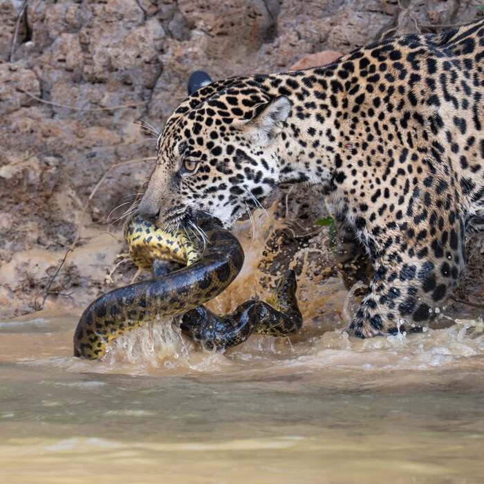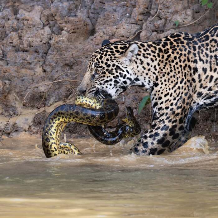 Мы плыли на лодке по реке Трес-Ирмаос в бразильском Пантанале. Мы преследовали самку ягуара и её детёныша, и они исчезли в водной растительности. Несколько мгновений спустя я услышал рёв дерущегося ягуара. Вскоре после этого она появилась в реке и что-то несла прямо под поверхностью воды. Сначала я подумал, что это кайман, но это была желтая анаконда (Eunectes notaeus). В течение нескольких секунд анаконда пыталась сопротивляться, поднимая голову из воды в попытке ударить ягуара, но в конце концов рептилия была убита.