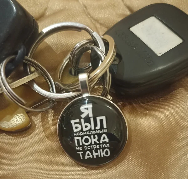 Круглый брелок для ключей «Я был нормальным, пока не встретил Таню». Стоит такой около 90 руб. Ссылка на него
