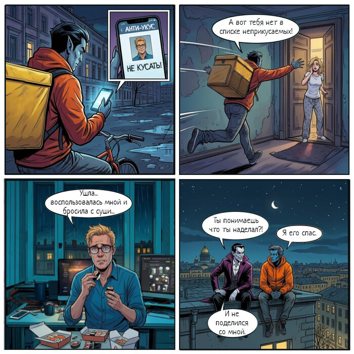 — Так зарегистрируйся вампиром, встань на учёт! — кричала в ответ Зоя. — Будет тебе полный паёк, и маму подлечат. Зачем этот цирк с «нормальностью»?