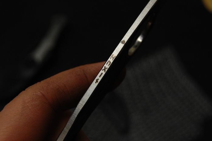 Лазерная гравировка тоже в стиле предыдущего ножа. Язык-алфавит тот же, Валькнут присутствует. Только имя Мунин.