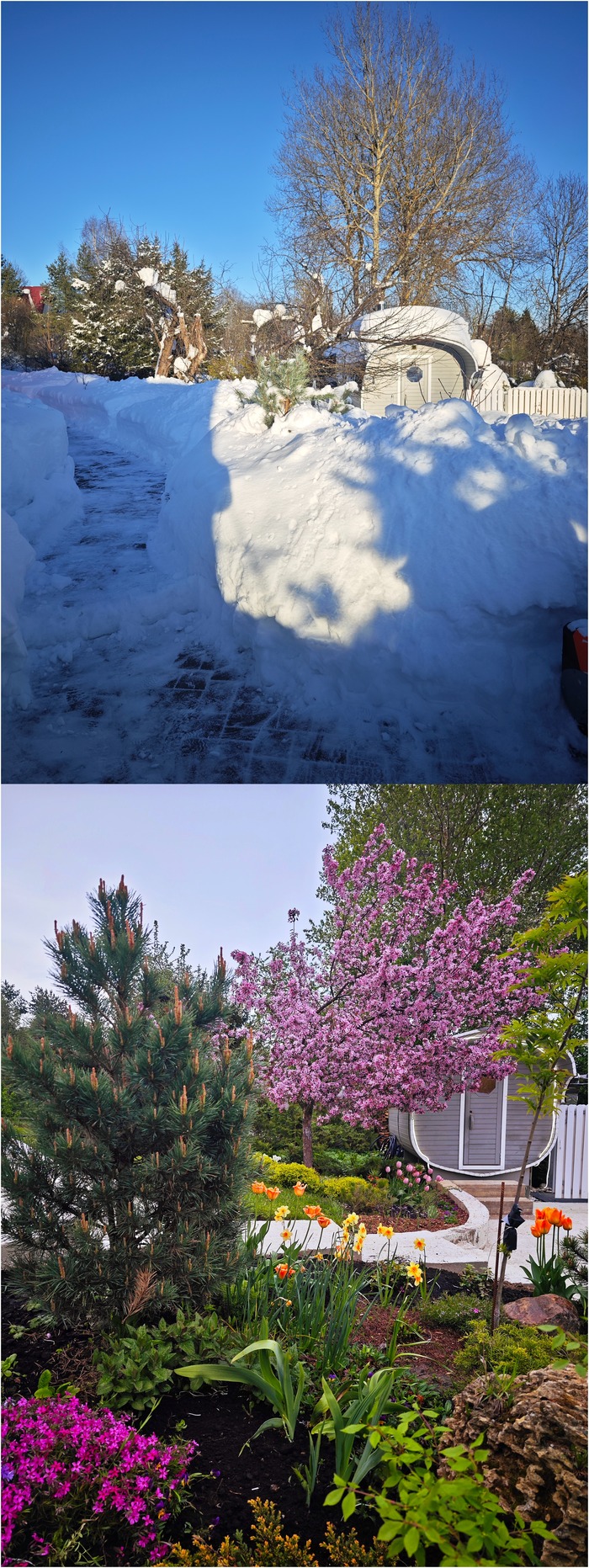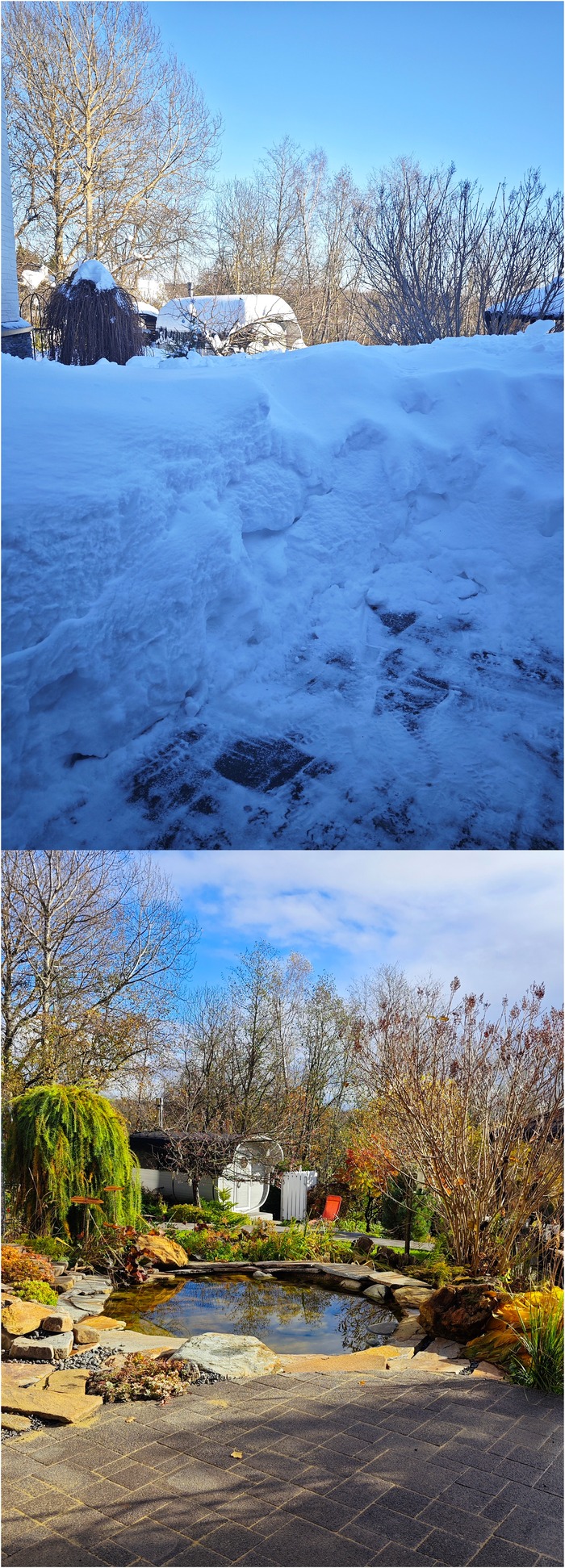 Сугробы уже почти с меня ростом, полтора метра уж точно есть. Странно понимать, что под ними спит сад и под этой грудой снега скрывается прудик с ручьём 😁