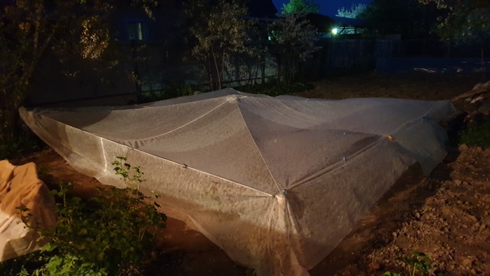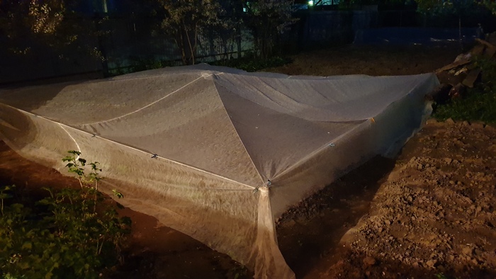 Тем временем неделя закалки в теплице прошла. Время высаживать в грунт! Целый день, каждый кустик своими ручками. 8 сортов, 16 борозд по 15 кустов - 240 кустов! К вечеру всё готово! Помня о гибели первой посадки, берегу как зеницу ока - натягиваем укрывной материал. От солнца, от града, от чёрта лысого. Зачем столько? - Перестраховка на случай частичной гибели.