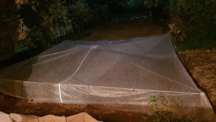 Тем временем растишки на основной плантации окрепли и прижились. Укрывной материал сняли и по закону подлости пришёл ливень с градом...