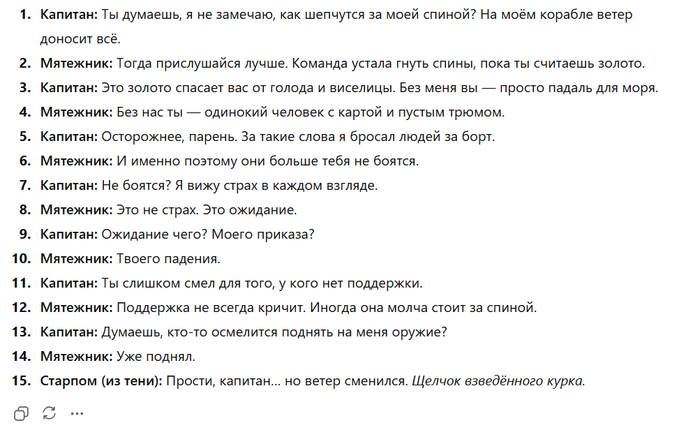 Для диалога: «Симулируй спор двух персонажей: капитан пиратов и мятежник; 15 реплик, нарастающее напряжение, заканчивается предательством.»