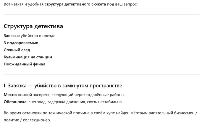 Для сюжета с поворотом: Разработай структуру детектива: завязка — убийство в поезде, 3 подозреваемых, кульминация на станции; включи ложный след и неожиданный финал.»