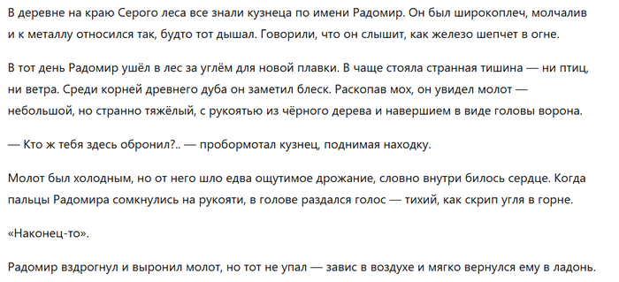 Для завязки и идей: «Напиши короткую историю в жанре фэнтези: герой-кузнец находит магический молот в лесу, но он проклят; 500 слов, с диалогом и твистом в конце.»