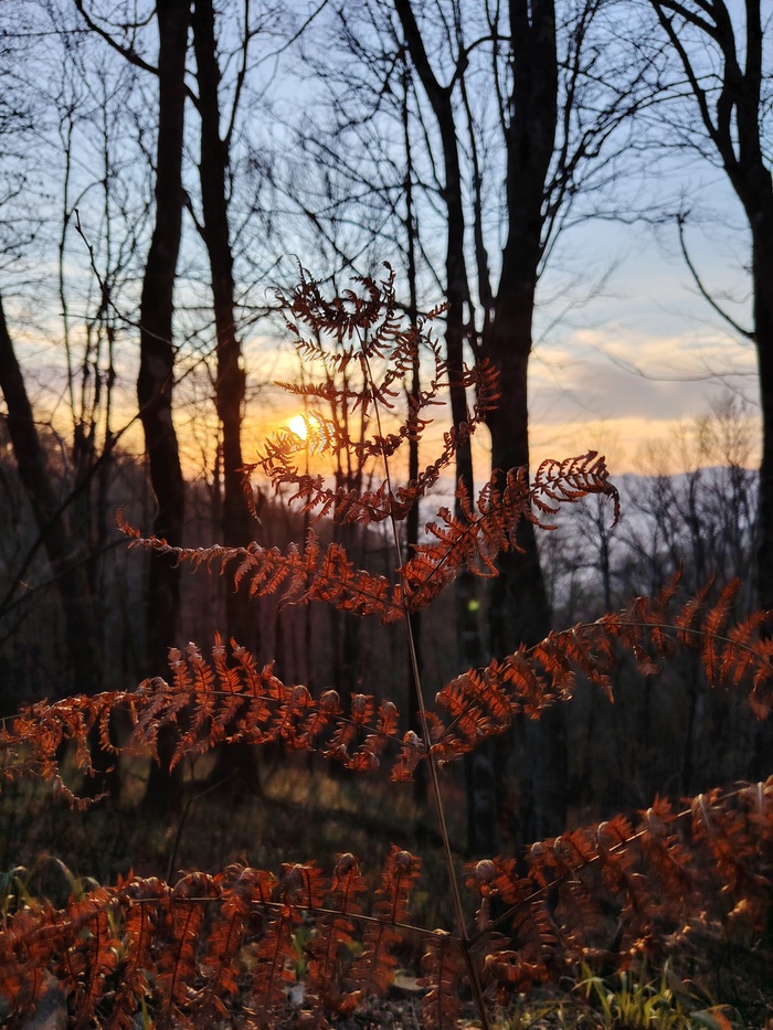 Обратный путь начался красиво: закат окрасил золотым окрестные вершины, причудливые скалы Индюка и серебристые стволы деревьев.