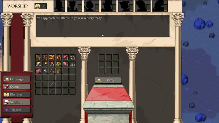 В целом, первичных заданий пока маловато. Например, построить алтарь. Взаимодействий внутри алтаря много. Стоит делать подношения в надежде открыть кого-то из пантеона.
