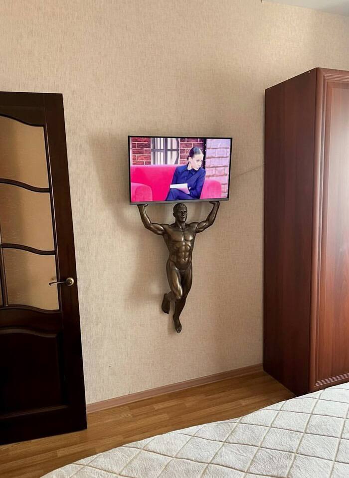 Напротив спроектировали длинную столешницу, объединившую место для работы и подвесные тумбы под ТВ в оливковом цвете. Гардеробную часть отделили перегородкой из затемненного фактурного стекла, что сохранило визуальный простор и скрыло наполнение полок.