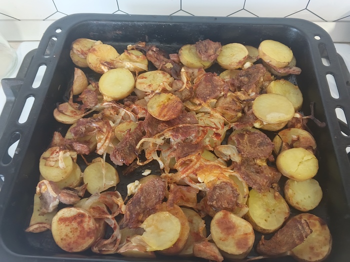 3. Выложите курицу и картофель на противень и запекайте при 180°C примерно 40–45 минут.