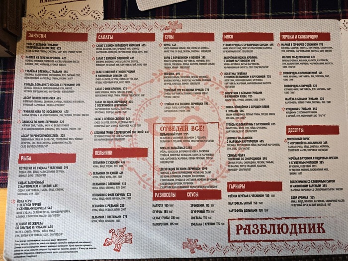Меню ресторана достаточно разнообразное: даже среди традиционной кухни можно найти блюда на любой вкус. В глаза сразу бросается слово «бобрятина». К слову, в ресторане были представлены блюда из разнообразной дичи, но бобрятина — вообще что-то необычное для моего понимания. Было решено заказать самое первое, что приходит на ум при слове «Пермь», — посикунчики. Кстати, здесь отдельный лист меню посвящён только этим местным пирожкам. Взяли на пробу с бобрятиной и ассорти начинок. Лично для меня мясо бобра — очень странное и на вкус, и на запах, но попробовать для экспириенса стоит. А вот какая начинка совсем не понравилась, так это крапива. Конечно, на вкус и цвет, но для меня это слишком травянисто и не сочетается с тестом, хотя посикунчики с крапивой здесь считаются действительно местным и традиционным блюдом.