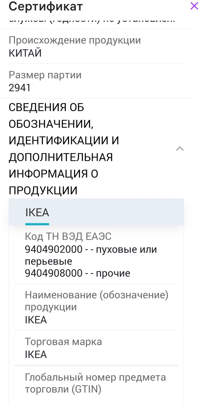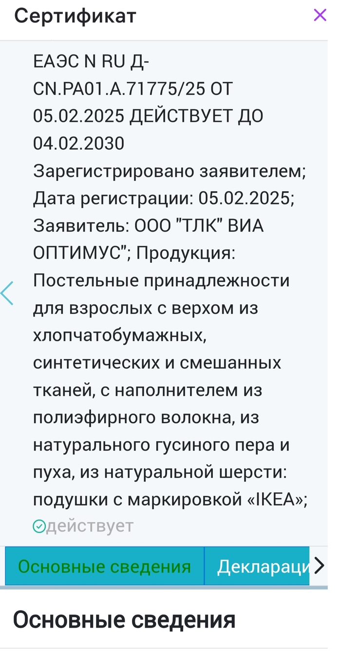 Но не поняли. Вместо сертификата нам показали какую-то декларацию на подушки с маркировкой "Икея". Там правда по-русски написано, хотя продаётся подушка как IKEA. И дата у этой декларации февраль 2025 года, хотя подушка произведена в 2022 году, если верить написанному на упаковке. Какая-то машина времени подумали мы.