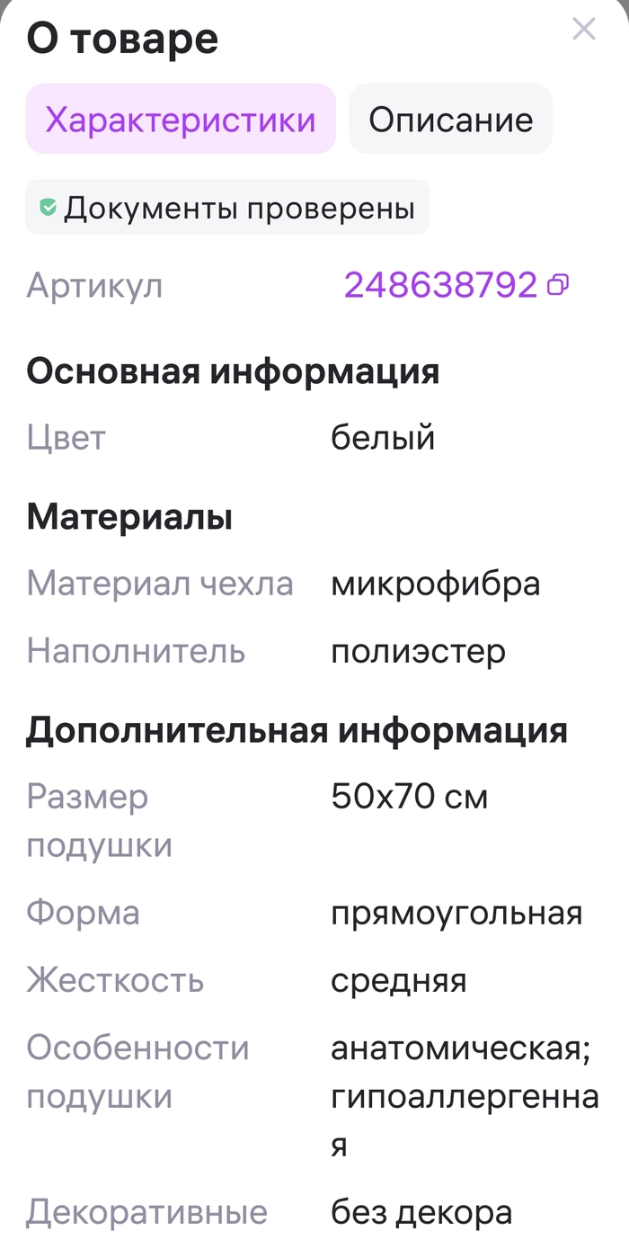 Нашли подушку, увидели что на WB производителем тоже указана Россия. Вообще у продавца много товаров Икеи, не только подушки, но и одеяла, и что-то ещё. Это удивило ещё сильнее, я-то думала что мне могла достаться какая-то завалящая подушка, тут много всего и всё это валяется где-то с 2022 года и никто их не купил? Но тут мы заметили что в информации есть пометка "Документы проверены", значит у WB есть какие-то документы, которые он проверил и мы сможем понять куда обратиться насчёт вони от подушки. Сейчас всё поймем, подумали мы, там же написано что продавец прислал документы, которые подтверждают безопасность товара.