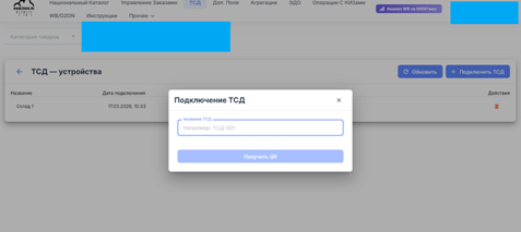 В личном кабинете создайте новое устройство (например, «Склад ТСД 1»), получите QR‑код привязки и сканируйте его через приложение.